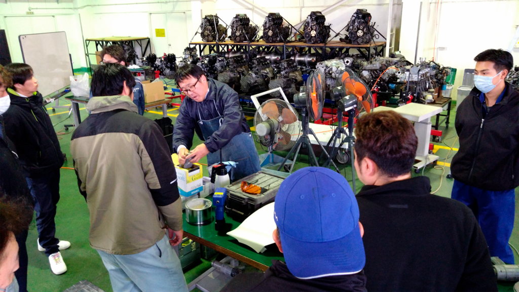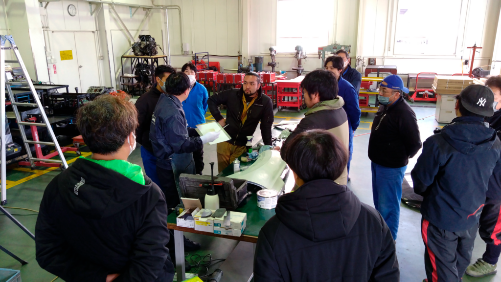 そんな中、なんと秋田県から「オートボディ阿部」の阿部社長が、わざわざ自費でサポートに駆けつけてくださいました! 以前から講習を見てくださっている阿部社長より、 「座学の内容が以前よりグレードアップしている」 「実験の実演もさらに進化している」 と驚きとお褒めの言葉をいただき、講師として大きな自信になりました。